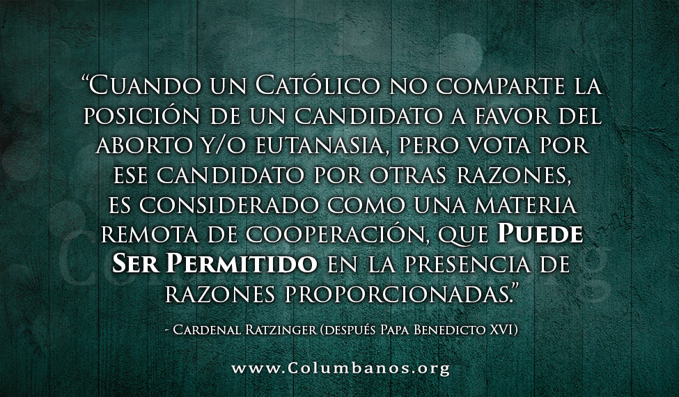 El mismo Cardenal Ratzinger (después Papa Benedicto XVI) explicó: “Cuando un Católico no comparte la posición de un candidato a favor del aborto y/o eutanasia, pero vota por ese candidato por otras razones, es considerado como una materia remota de cooperación, que PUEDE SER PERMITIDO en la presencia de razones proporcionadas.” Juan Pablo II ha dicho lo mismo en Evangelium Vitae, hablando de los funcionaros electos votando sobre la legislación. Los obispos Católicos Americanos dicen esto en su documento “Formando Conciencias para Ciudadanos Creyentes.”
